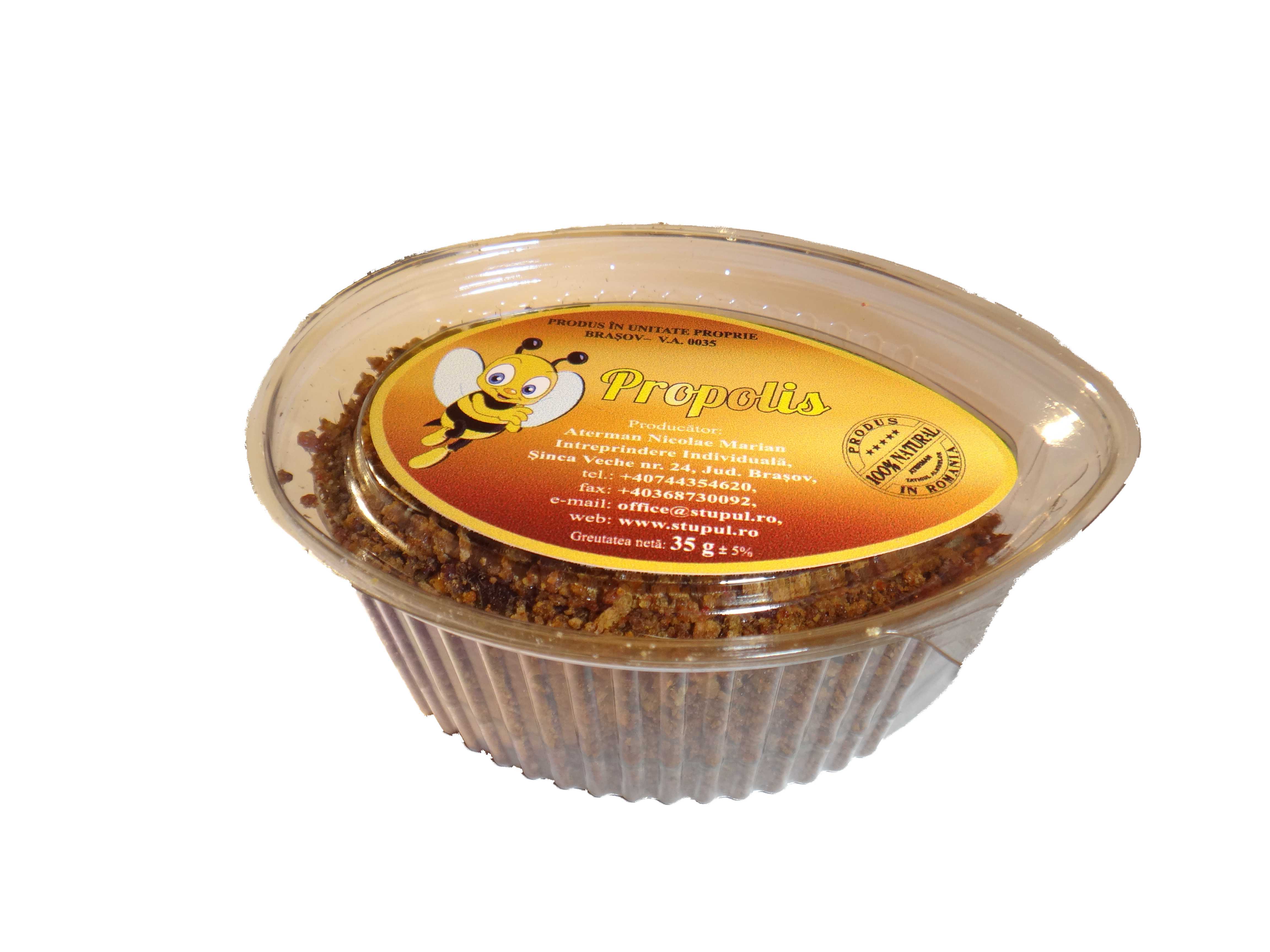 Propolisul este o substanta rasinoasa aromata colectata de albine din mugurii si axilele frunzelor anumitor copaci. Albinele utilizeaza propolisul pentru a crea un mediu steril in interiorul stupului si ca mijloc de aparare impotriva microbilor si a mucegaiurilor.